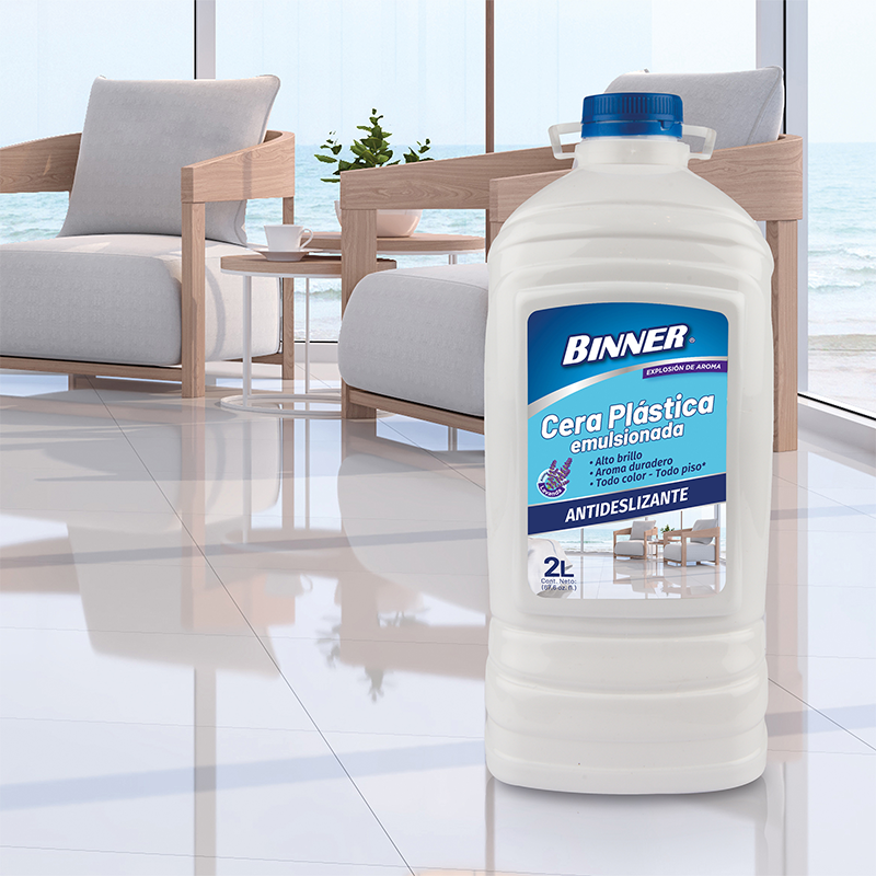 Binner® Cera plástica emulsionada contiene una formula especializada que protege sus pisos de cerámica, baldosa, vinilo, caucho, mármol y granito, bridándole una película plástica antideslizante. Deja un agradable y duradero aroma a lavanda en el ambiente. Producto de uso doméstico.