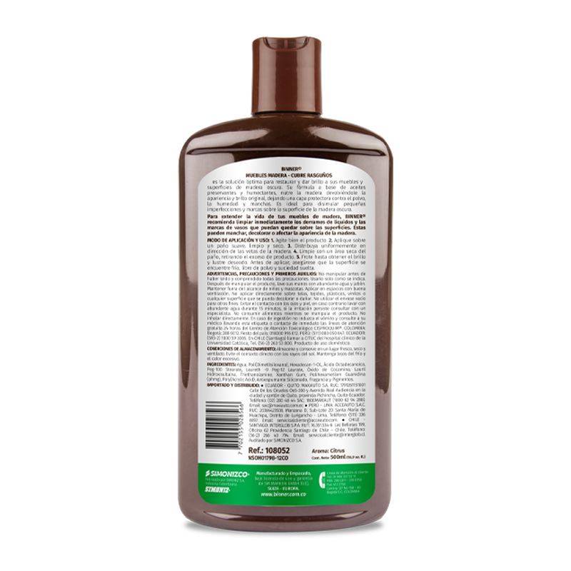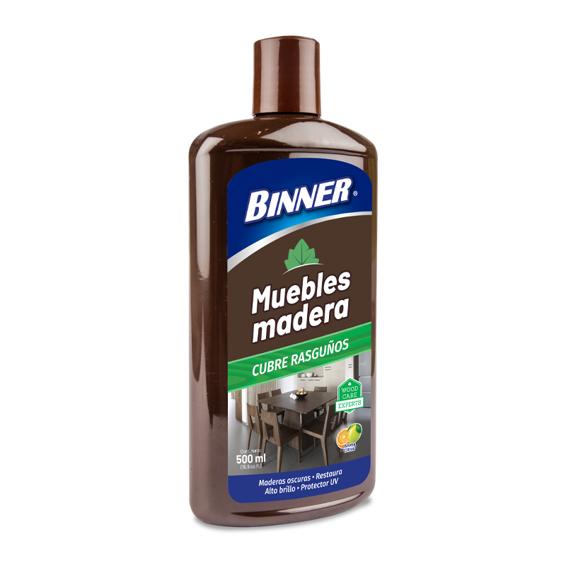 BINNER® MUEBLES DE MADERA – CUBRE RASGUÑOS es la solución óptima para restaurar y dar brillo a sus muebles y superficies de madera oscura. Su fórmula a base de aceites preservantes y humectantes, nutre la madera devolviéndoles la apariencia y brillo original, dejando una capa protectora contra el polvo, la humedad y manchas. Es ideal para disimular pequeñas imperfecciones y mascas sobre la superficie de la madera oscura. Para extender la vida de tus muebles de madera, Binner® recomienda limpiar inmediatamente los derrames de líquidos y las marcas de vasos que puedan quedar sobre las superficies. Estas pueden manchar decolorar o afectar la apariencia de madera.