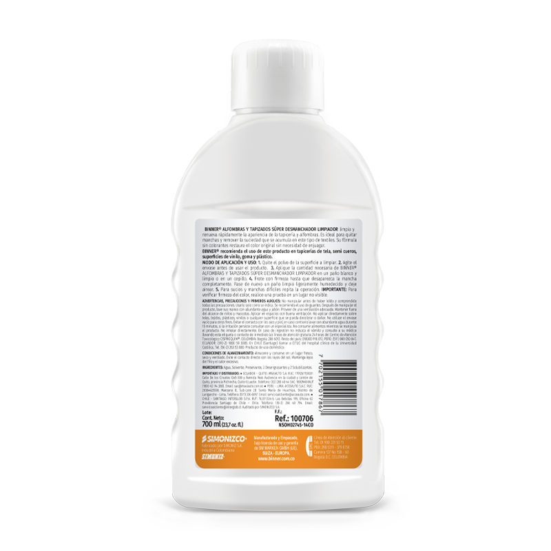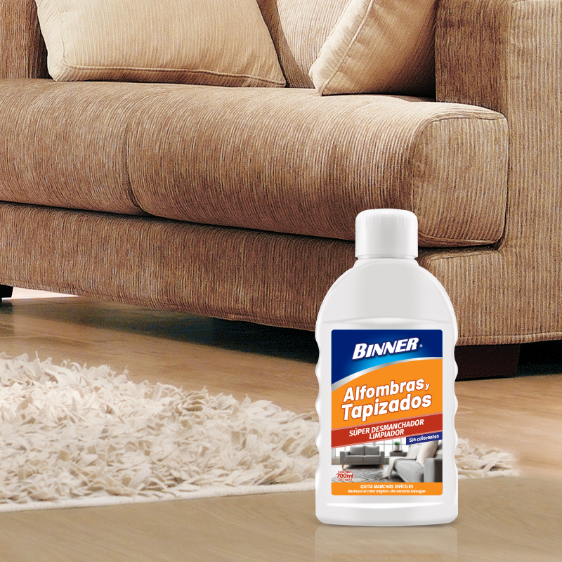 BINNER® ALFOMBRAS Y TAPIZADOS DESMANCHADOR LIMPIADOR limpia y renueva rápidamente la apariencia de la tapicería y alfombras. Es ideal para quitar manchas y remover la suciedad que se acumula en este tipo de textiles. Su fórmula sin colorantes restaura el color original sin necesidad de enjuagar.