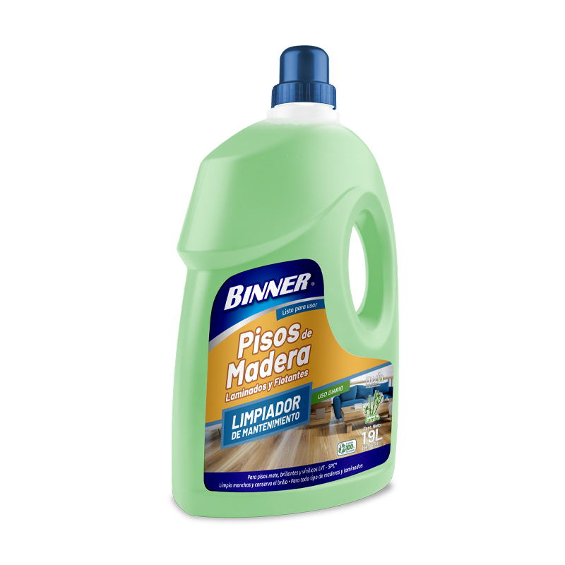 BINNER® PISOS DE MADERA LAMINADOS Y FLOTANTES LIMPIADOR DE MANTENIMIENTO es el complemento ideal de fácil aplicación y de uso frecuente para la limpieza de todos los pisos de madera maciza, lacada, parquet, laminada, flotantes de base HDF (madera aglomerada HD), PVC y para los nuevos pisos Vinílicos Flotantes tipo Madera LVT – SPC*(Luxury Vinyl Tile). Por su fórmula es ideal para limpiar todos sus pisos y superficies de madera sin deteriorarlos, potencializa la duración y el brillo generado por los protectores de brillo, debido a que estos, por el tráfico diario absorben polvo y partículas que lo van opacando.