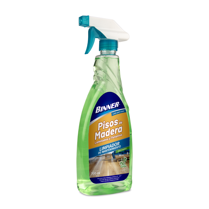 BINNER® PISOS DE MADERA LAMINADOS Y FLOTANTES LIMPIADOR DE MANTENIMIENTO es el complemento ideal de fácil aplicación y de uso frecuente para la limpieza de todos los pisos de madera maciza, lacada, parquet, laminada, flotantes de base HDF (madera aglomerada HD), PVC y para los nuevos pisos Vinílicos Flotantes tipo Madera LVT – SPC*(Luxury Vinyl Tile). Por su fórmula es ideal para limpiar todos sus pisos y superficies de madera sin deteriorarlos, potencializa la duración y el brillo generado por los protectores de brillo, debido a que estos, por el tráfico diario absorben polvo y partículas que lo van opacando.