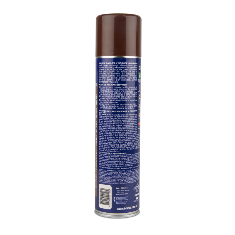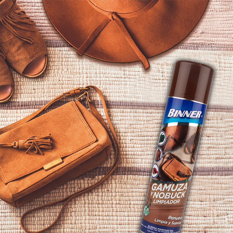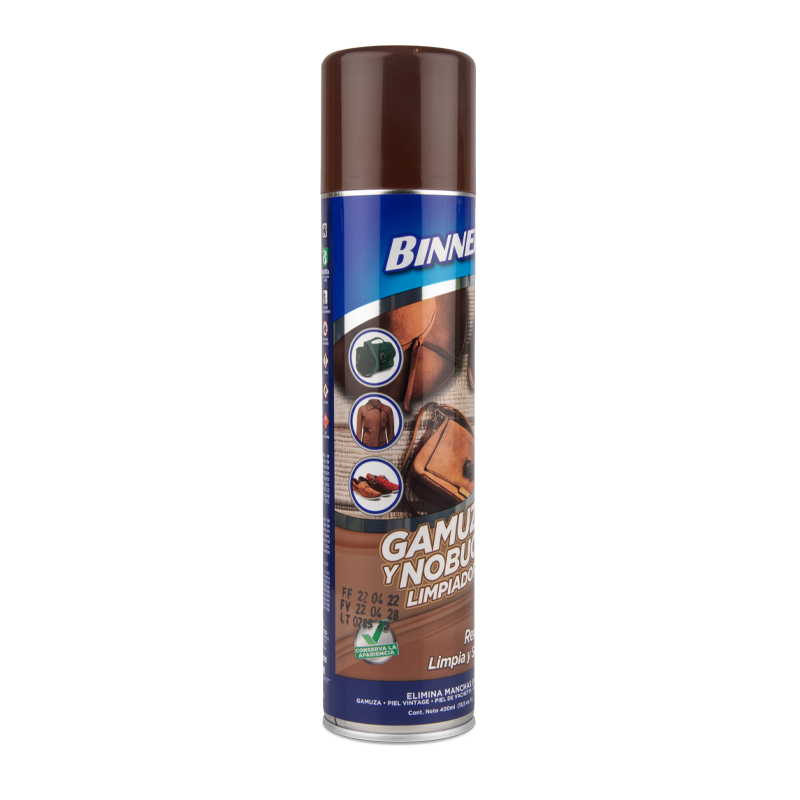 Binner® Gamuza y nobuck limpiador especialmente desarrollado para mejorar el color, devolverles la apariencia original a los objetos de gamuza y nobuck. Es ideal para todos los tonos ya que el producto es incoloro. Es necesaria su utilización cuando los objetos presentan manchas de grasa, aceite, café, tierra, brillos y parches por suciedad. Limpia, desengrasa y suaviza.