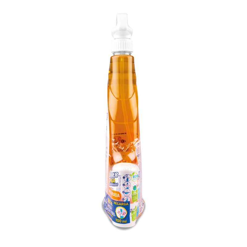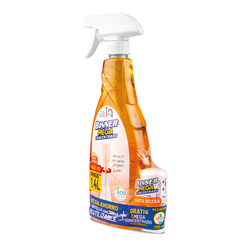 BINNER® MEGA Concentrado QUITAGRASA cocina es la nueva tecnología de limpieza eco-sostenible de uso diario, que disuelve la grasa al instante. Remueve manchas difíciles como grasa pegada, salpicaduras de aceite y olla a presión, leche y comida quemada, entre otros. Su poderosa limpieza citrus, extrae los malos olores producidos por las frituras de pescado, pollo y carne. Con los repuestos Mega Concentrados de máximo desempeño de Binner®, consigue la limpieza y el ahorro anhelado, apoyando a la vez los Objetivos de Desarrollo Sostenible Mundiales, ODS 12-13-14 y 15.