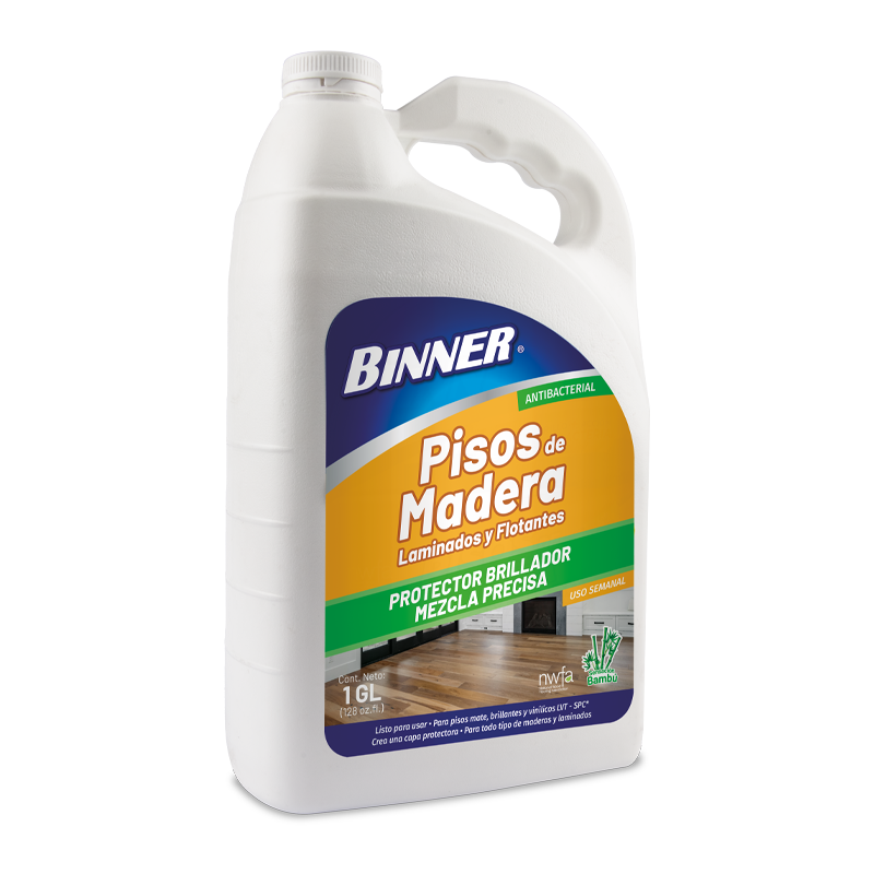 BINNER®PISOS DE MADERA, LAMINADOS Y FLOTANTES PROTECTOR BRILLADOR MEZCLA PRECISA es el mejor producto para el cuidado de pisos de madera maciza, lacada, parquet, laminada, flotantes de base HDF (madera aglomerada HD), PVC y para los nuevos pisos Vinílicos Flotantes tipo Madera LVT -SPC* (Luxury Vinyl Tile). Su tecnología única, ha sido especialmente formulada para el uso de profesionales y propietarios de vivienda. Crea una película protectora de alto brillo, proporcionando un efecto antideslizante, dejando un agradable aroma a bambú. Su acción antibacterial elimina bacterias tales como: Escherichia Coli, Pseudomonas Aeruginosa, Bacillus Subtillis, Salmonella Thyphymurium, Staphylococcus Aeureus, Aspergillus Brasiliensis y Candida Albicans. Con BINNER® PISOS DE MADERA su piso quedará protegido sin tanto esfuerzo, evitando el paso del tiempo. BINNER® ha cuidado y mantenido pisos profesionales de canchas de baloncesto, fútbol sala, salones de baile, bibliotecas y museos.