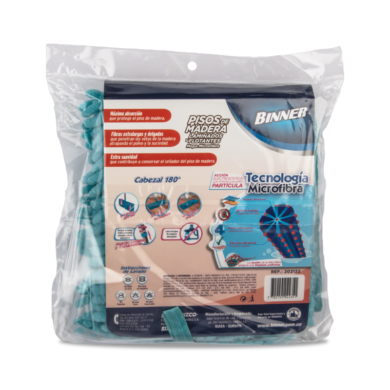 Es una mopa diseñada para pisos de maderas y laminados con una tecnología de microfibra que proporciona una extra suavidad que conserva el sellador del piso. Cuenta con fibras extra largas y delgadas que atrapan el polvo de lugares más difíciles; de máxima absorción que protege el piso de madera, seca, limpia y brilla sin rayar. Con una efectiva eficiencia, 4 veces más suave, elimina huellas, con una acción electrostática que atrapa cualquier partícula. Tener en cuenta: 1) Cabeza gira 180°. 2) Atrapa los líquidos. 3) Atrae el polvo. 4) Mango liviano y expandible (Alargue el mango hasta la longitud deseada y gírelo para fijarlo)