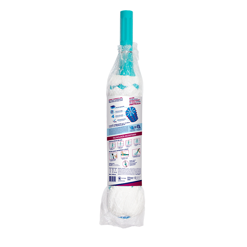 Trapero auto escurrible, 3 veces más eficiente. Repuesto cambio fácil. Brazo telescópico. Microfibra 3 veces mas absorbente. Cubre más. Gira y escurre sin usar las manos. Con actividad Antibacterial.